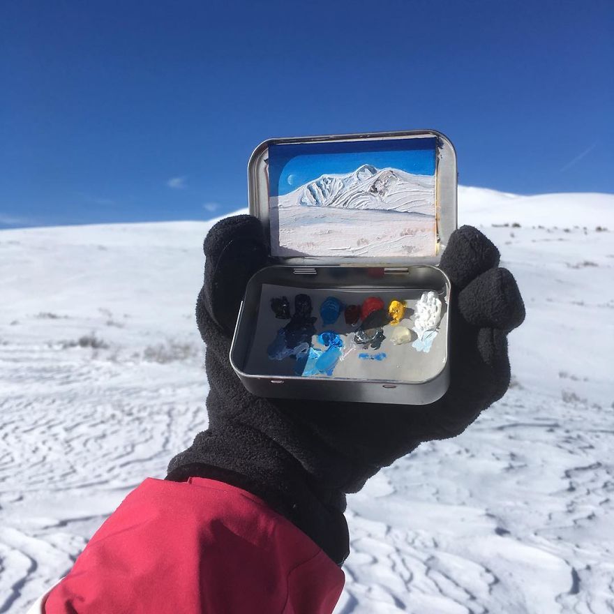 Boredpanda when we saw her works we decided to make introduction about her. "She paints mesmerizing landscapes in mint tins where she attaches small pieces of palette paper to the top, and lays out a small palette of colors to work with on the bottom.