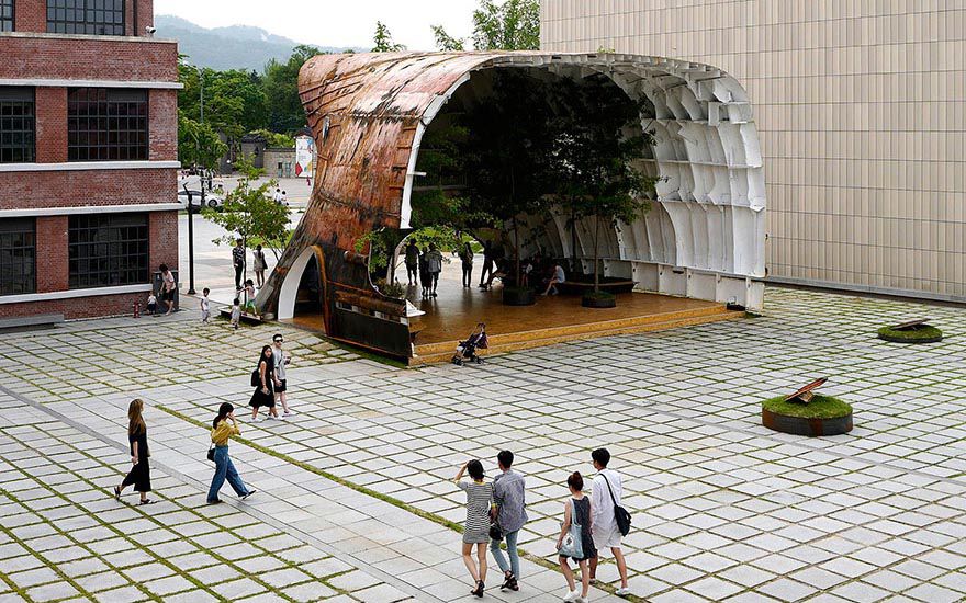 South Korea-based Shinslab Architecture created a stunning pavilion titled ‘Temp’L’ for 2016 Seoul Young Arichitects Program (YAP). Now featured in the National Museum of Modern and Contemporary Art Korea, Shinslab has transformed an old rusty ship into a modernized green building . It looks like casual abstract art at first, but when you take a closer look you’ll see something familiar… a ship! Shinslab Architecture chopped off a part of a ship, flipped it upside down, and turned it into a beautiful building that won this year’s MoMA Young Architects Program in Seoul. When entering the ship, visitors can find trees, benches, and a spiral staircase leading to a balcony – all in the middle of the ships rusty interior. The building epitomized the nostalgia of the ships past combined with the rebirth of modern luxury. It's truly stunning!