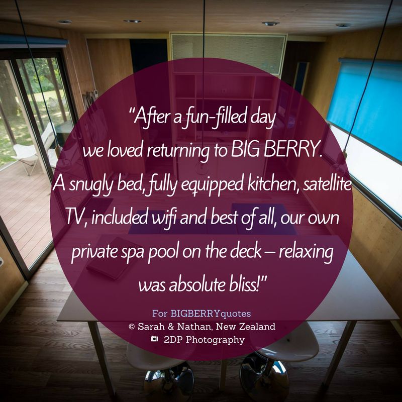 "After a fun-filled day, we loved returning to BIG BERRY. A snug bed, fully equipped kitchen, satellite TV, included wifi and best of all, our own private spa pool on the deck -relaxing was absolute bliss!"