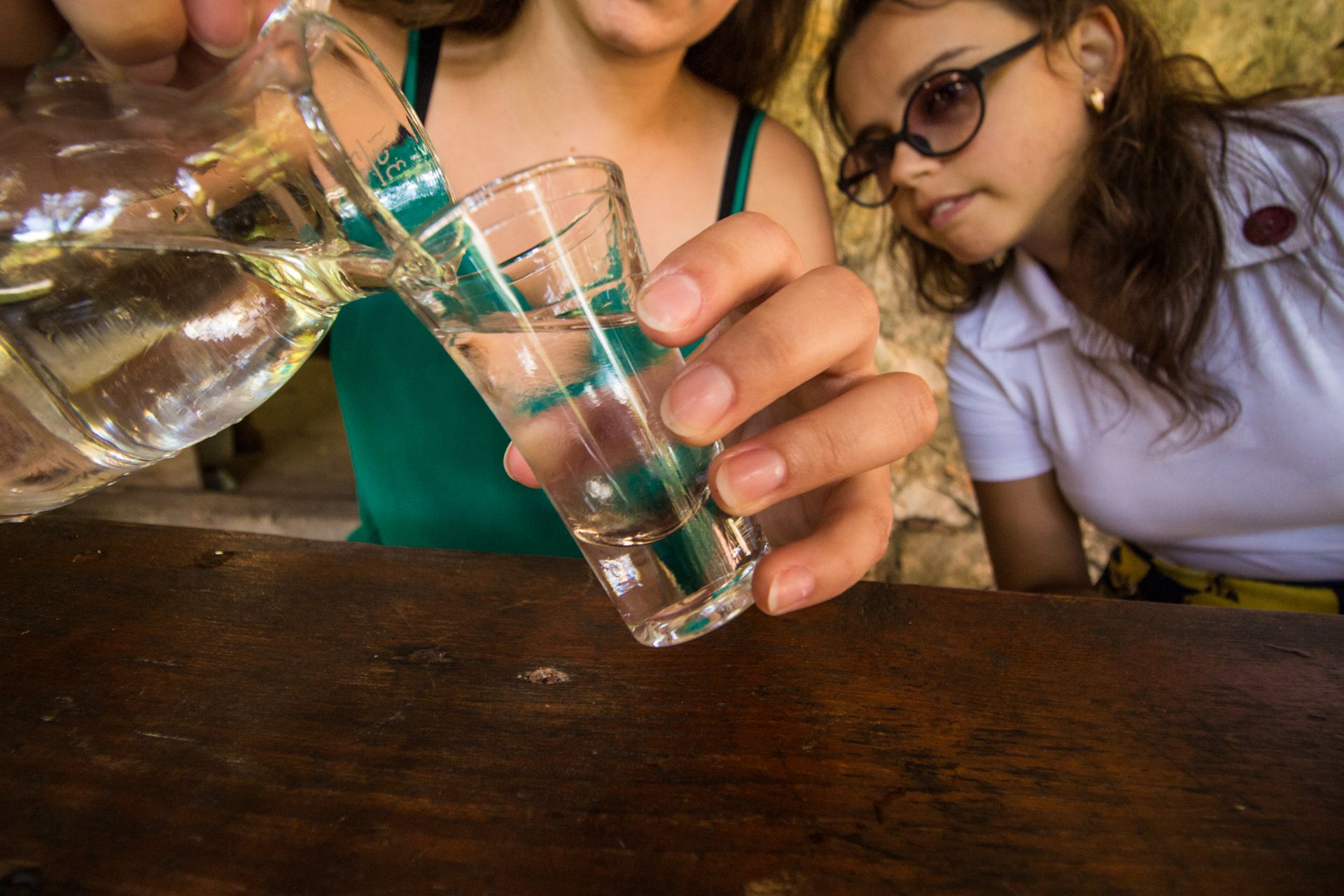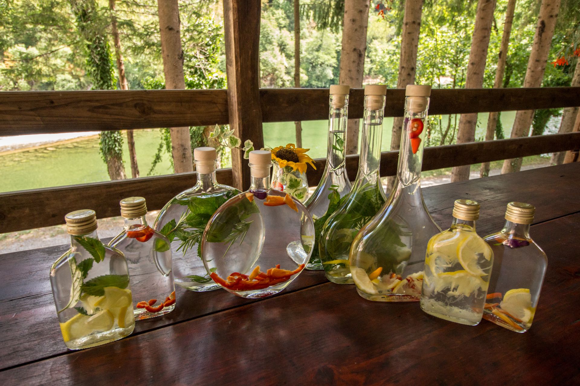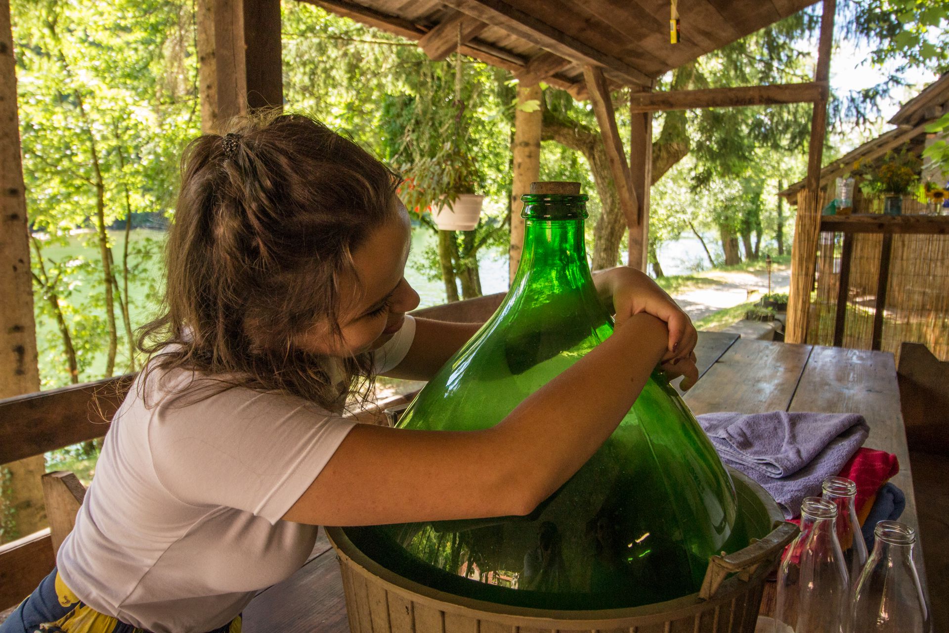 Full and happy, adopted Alice (or Alisa or whatever) was ready to move to the main part of the day — producing rakija. Rakija is made of dried grapes and is being kept in huge 50 liters bottles. After it reaches certain condition, it's time for rakija to be moved to a smaller bottle for measuring the amount of alcohol degrees. This one BIG BERRY team tried! A special alcohol thermometer shows you the amount of degrees by going deeper into the water. How much it sinks, that much is the amount of degrees. That day rakija was about 53 degrees. Usually Urška and her mom produce herb rakija or chili rakija. BIG BERRY team went crazy (as usual)! First rakija an adopted intern made was a killer one. She just didn't know about the amount of chili she needs to put! Too many peppers in one bottle. The second one was with herbs. Hopefully, this one will be better. Then... mixing! Herbs with lemon, chili with lemon, herbs with chili, just lemon, sweetened and unsweetened! Try everything.
