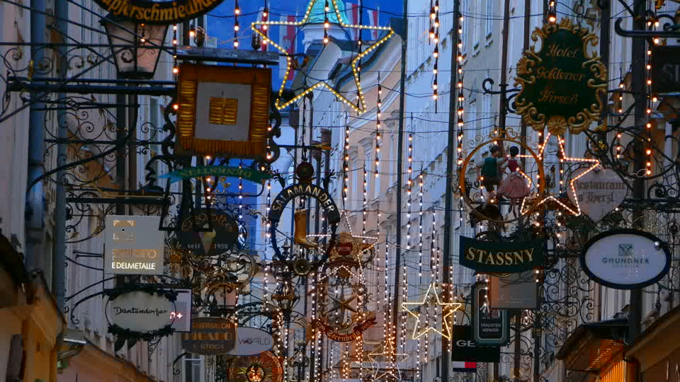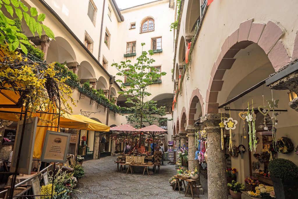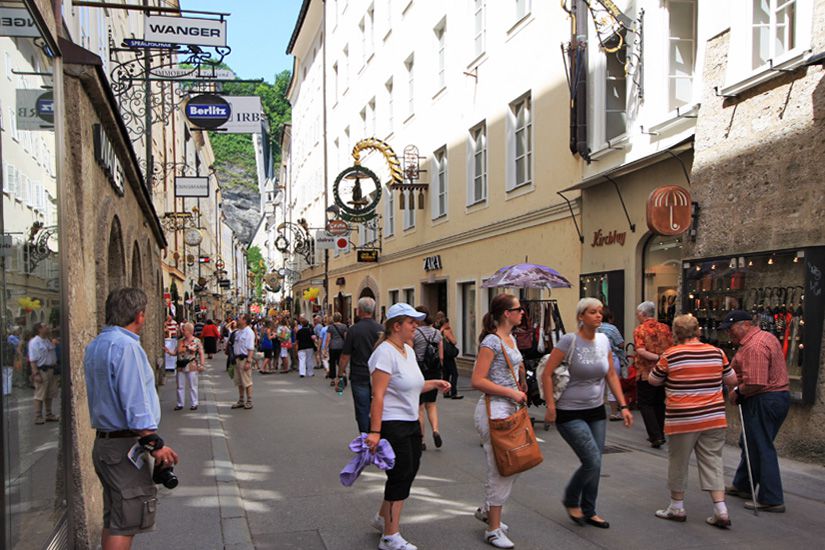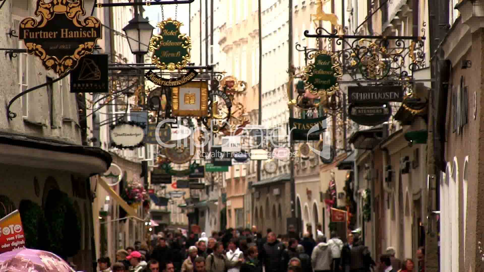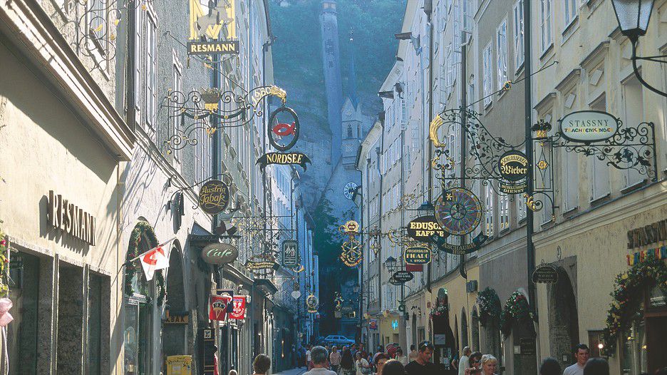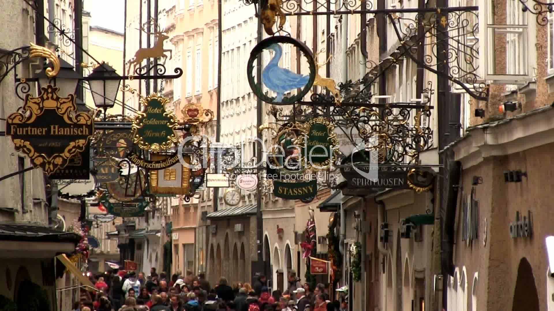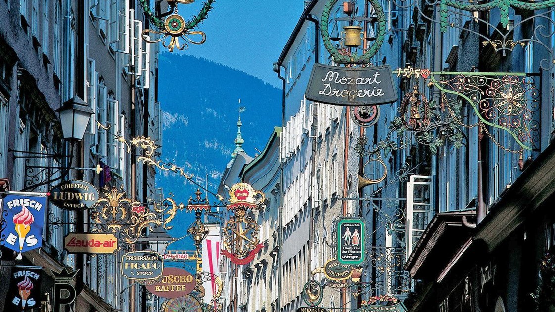The Salzburger Getreidegasse (with Hagenauerplatz and Badergäßchen) is located in the Old Town and is probably Salzburg's most famous historic street. Among other things, it houses the birthplace of Wolfgang Amadeus Mozart. The high narrow rows of houses with numerous wrought-iron guild signs over the old sales stores, together with the many-round through-buildings and courtyards, convey a self-contained image of a mediaeval street.