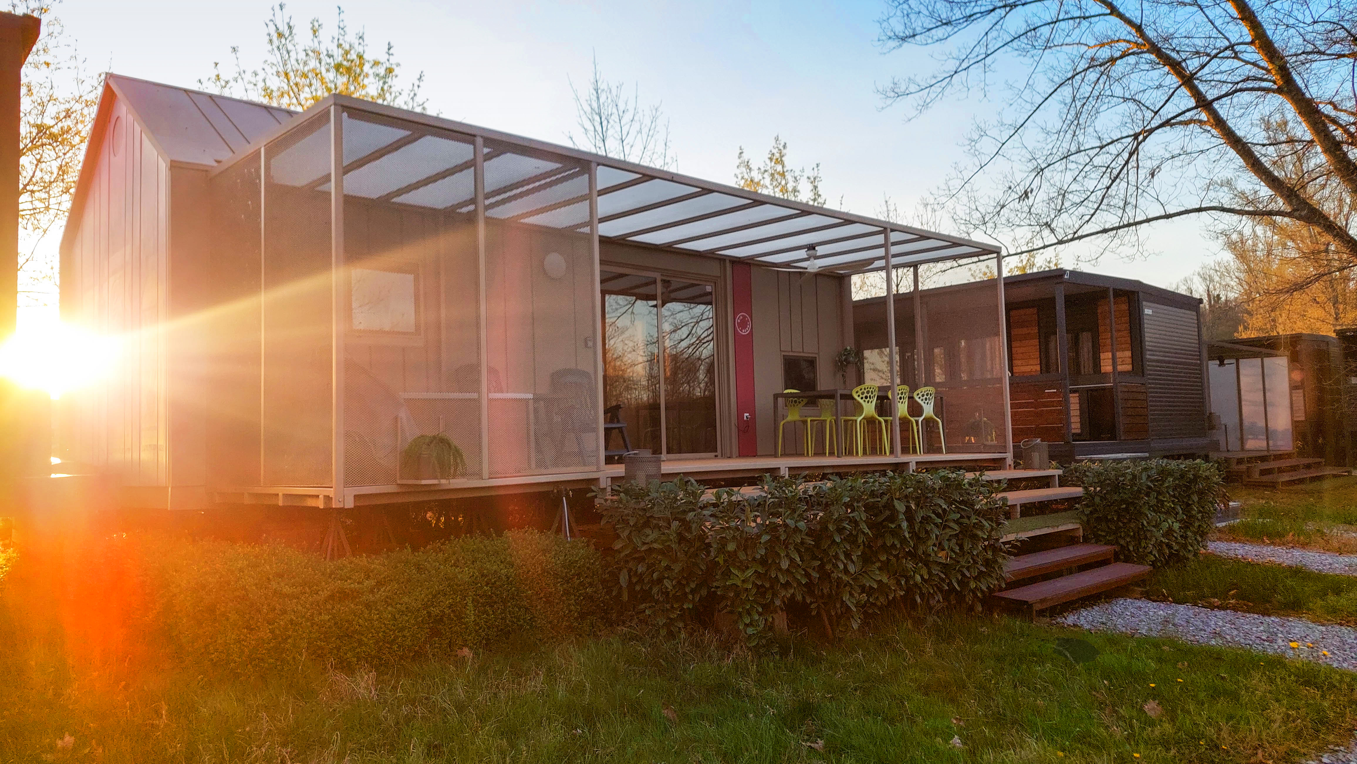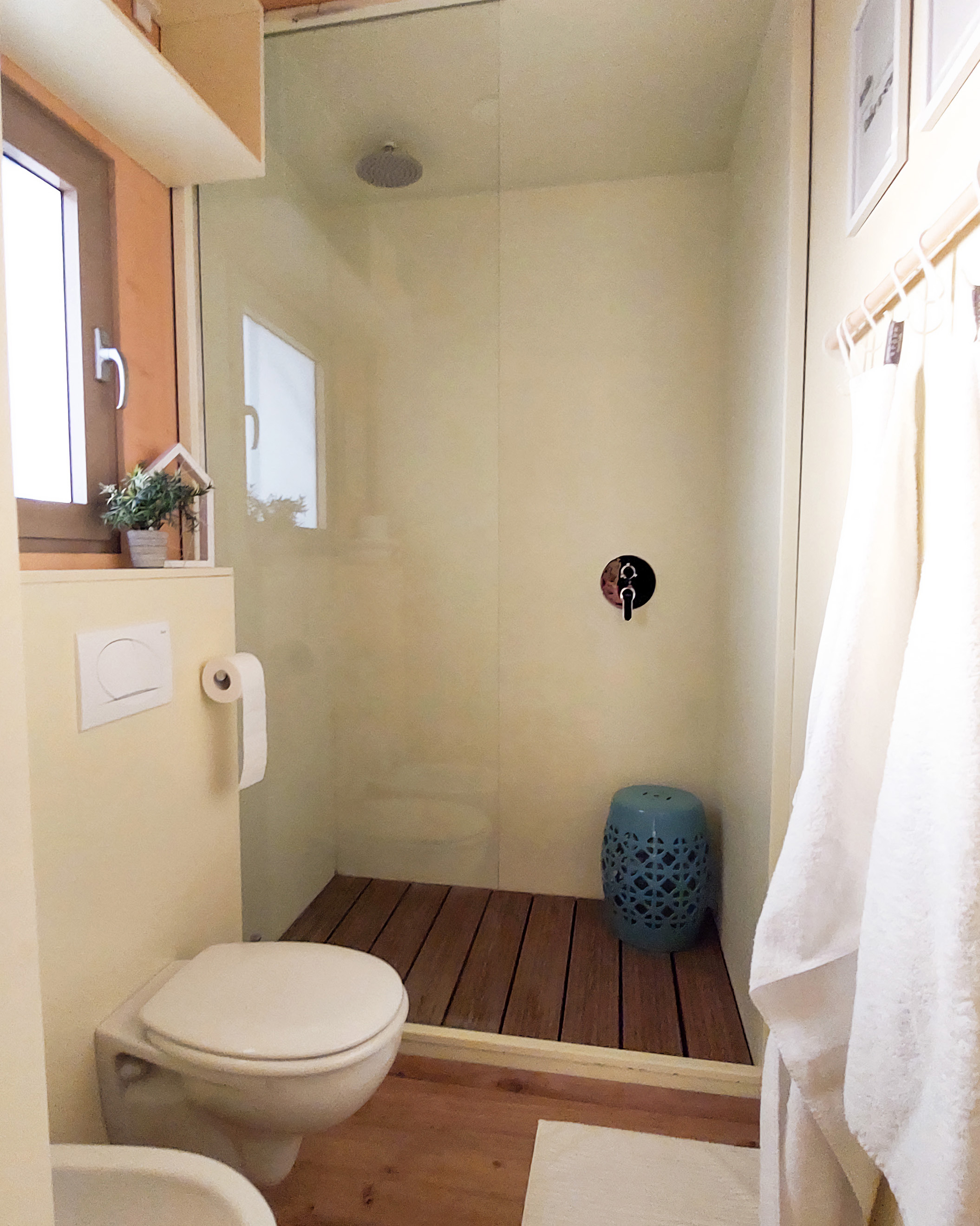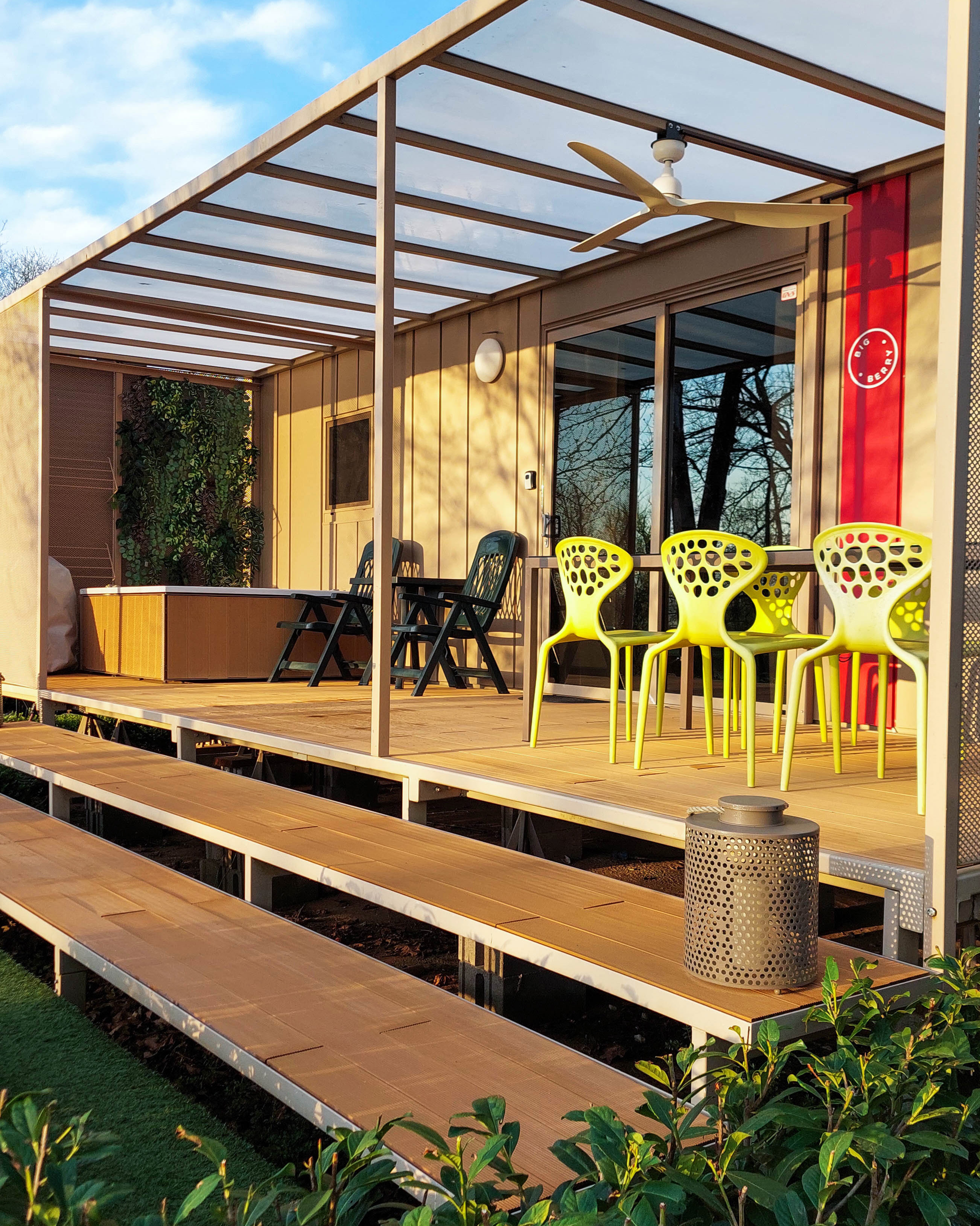 Uporaba zasebne masažne kadi na terasi hiške.