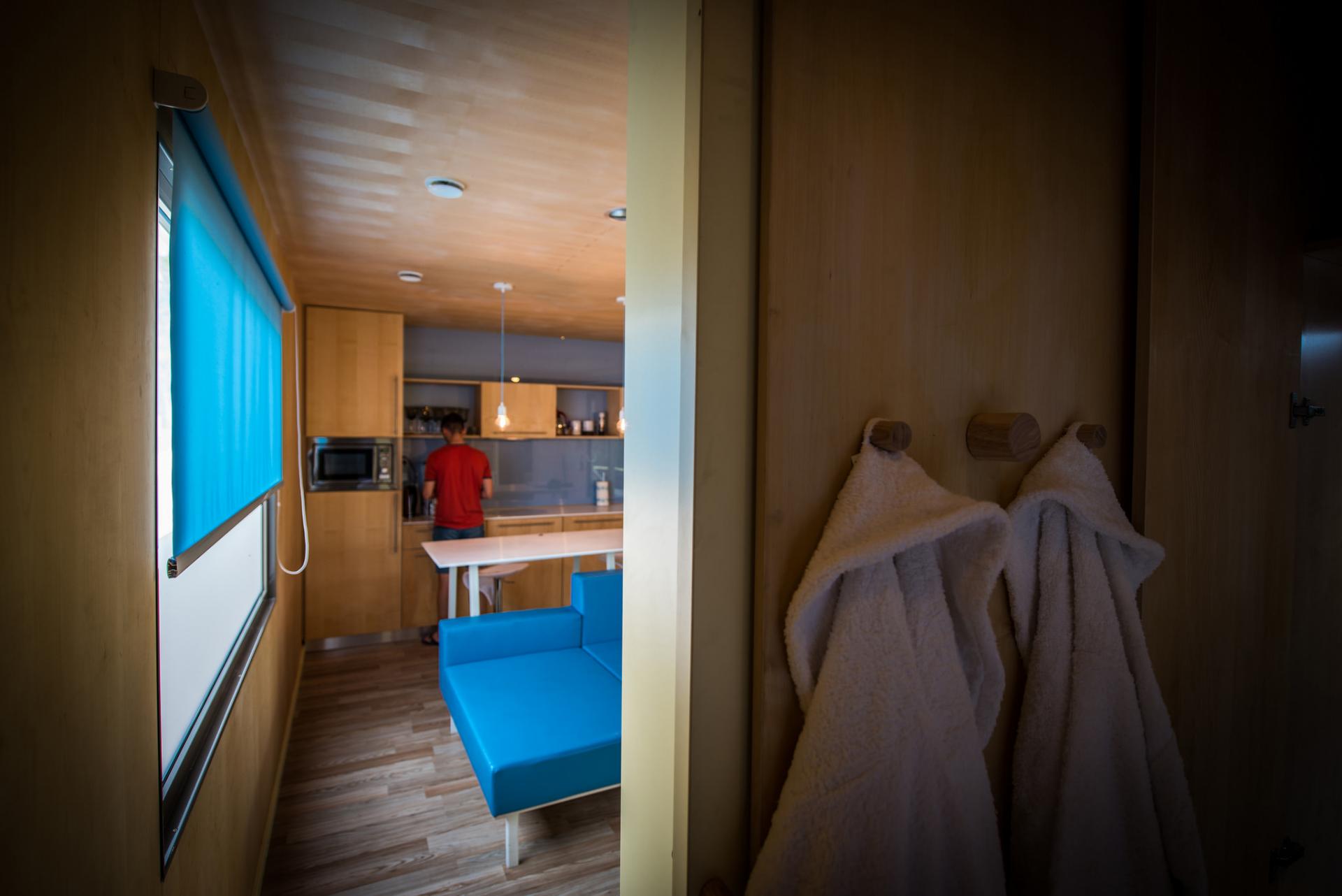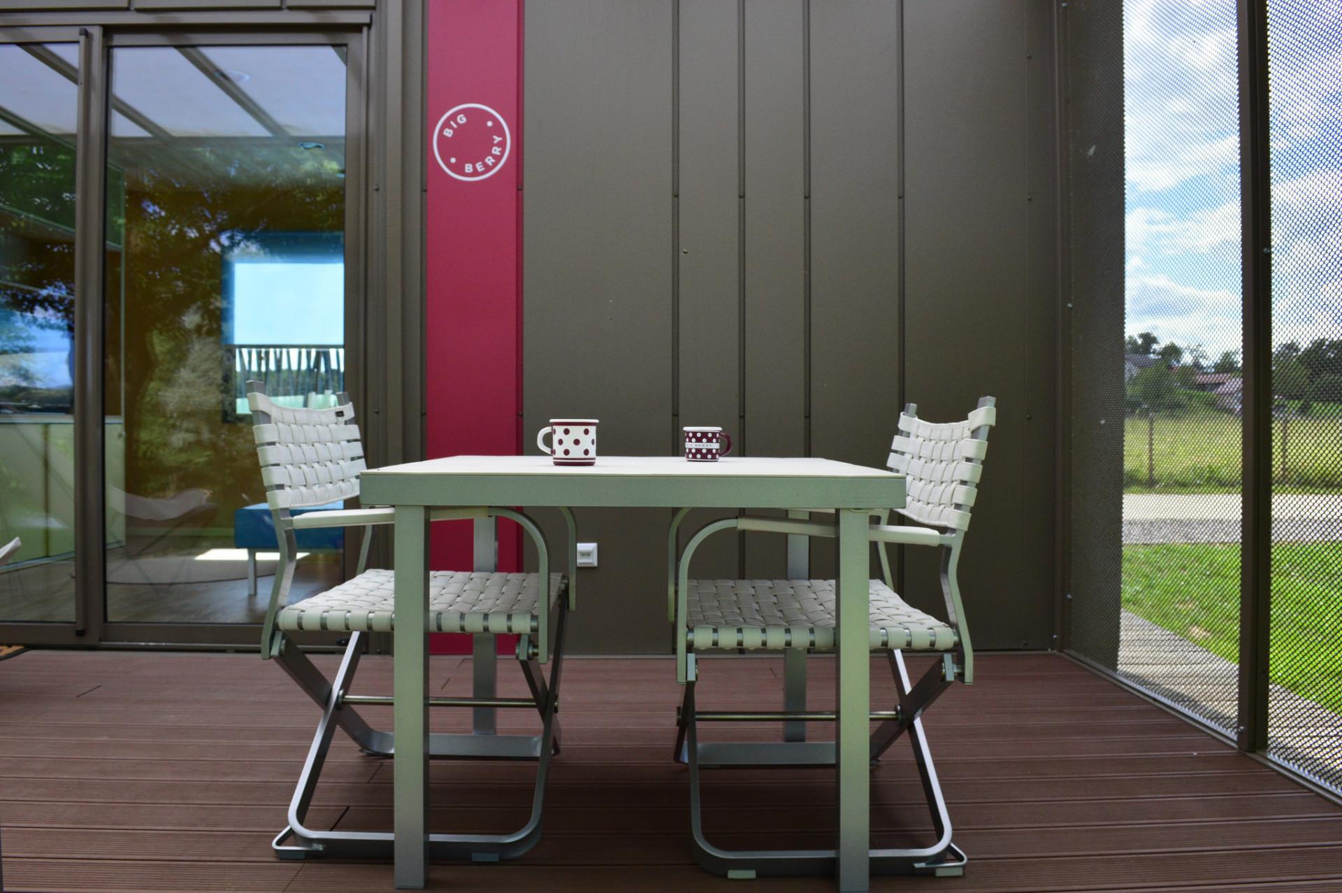 Uporaba zasebne masažne kadi na terasi hiške.